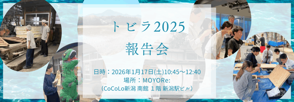 トビラプロジェクト報告会のお知らせ 今年7年目となった、地域×学生の魅力探求プロジェクト「トビラ」。新潟市の各地域で、有志の大学生がチームに分かれて活動することで、「また来たくなる地域」「また会いたくなる人」を増やし、一緒に地域を盛り上げる...
